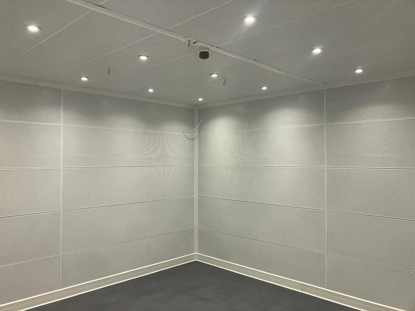 - Le traitement acoustique des surfaces : contrairement aux salles anéchoïques complètes qui utilisent des dièdres sur toutes les surfaces, dans une chambre calme on privilégie souvent des absorbeurs plans (laine minérale + parements — tôle perforée peinte) pour les murs et plafonds, afin de faciliter l’entretien, optimiser l’espace, tout en gardant une bonne absorption acoustique.