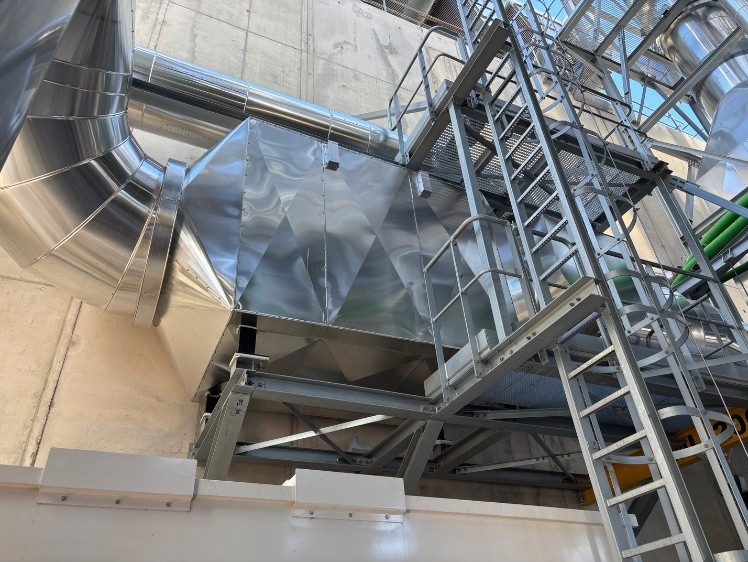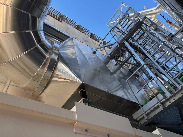 Côté structure, le silencieux repose sur une ossature rigide en acier galvanisé, renforcée pour résister à l’environnement extérieur (corrosion liée aux intempéries), ainsi qu’à la température et au débit d’air transitant dans la cheminée. L’enveloppe a été calorifugée avec une tôle isoxale en continuité avec le reste de la gaine.