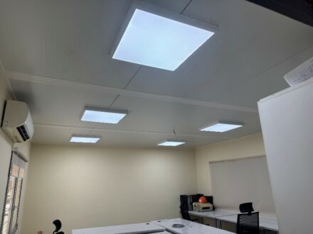 Le projet intègre également des adaptations spécifiques à la structure du bâtiment : limitations d’encombrement, contraintes de résistance des voiles béton, préservation des accès et équipements techniques déjà en place. Un encoffrement coupe-feu a été réalisé autour des gaines de reprise d’air pour maintenir la conformité réglementaire entre la chambre anéchoïque et le hall soufflerie.